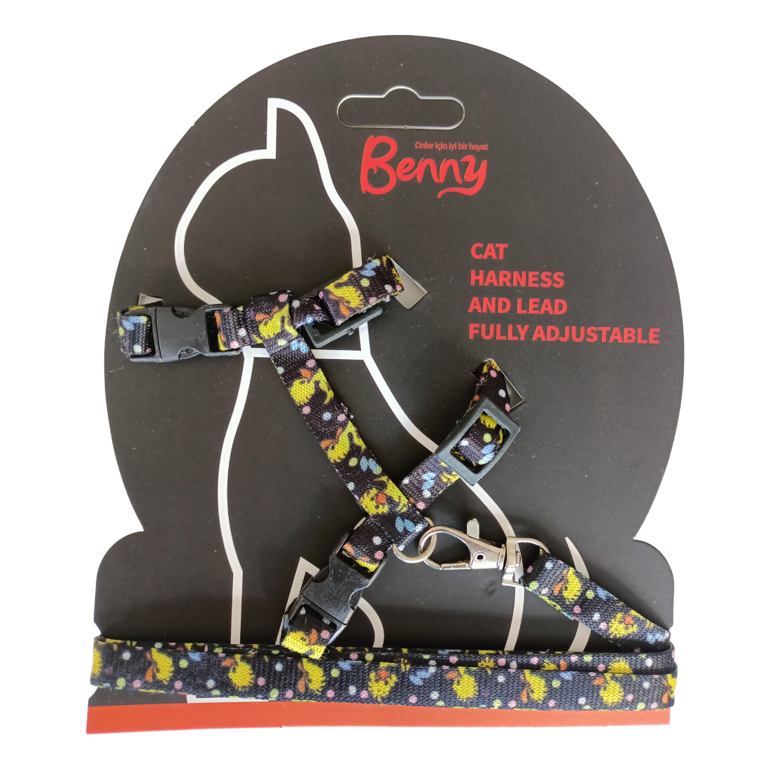 Üzerinde ördek desenleri mevcut kedi göğüs tasması ve gezdirme kayışından oluşat gezdirme setidir.