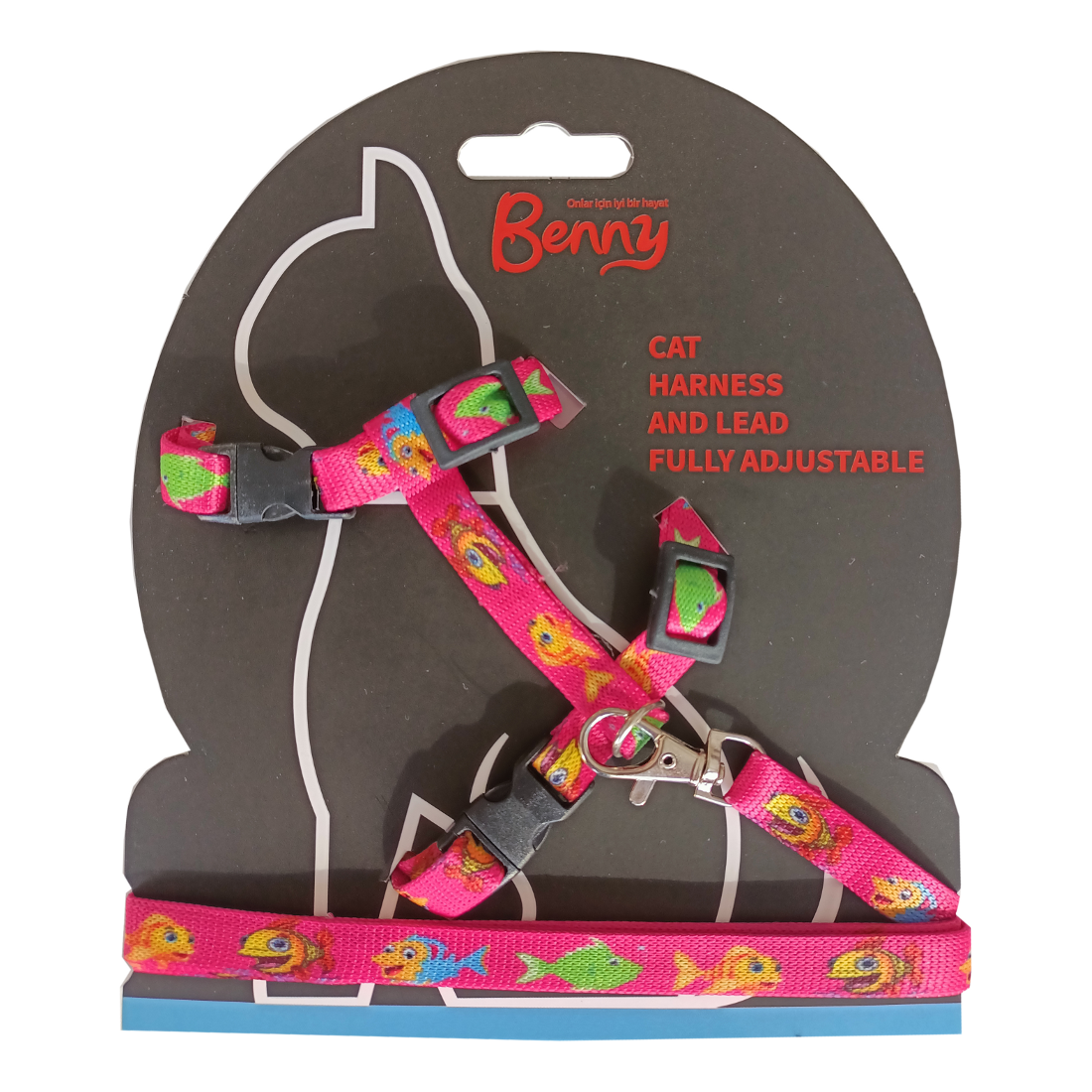 Üzerinde kırmızı şerit üzerine balık desenleri mevcut kedi göğüs tasması ve gezdirme kayışından oluşat gezdirme setidir.