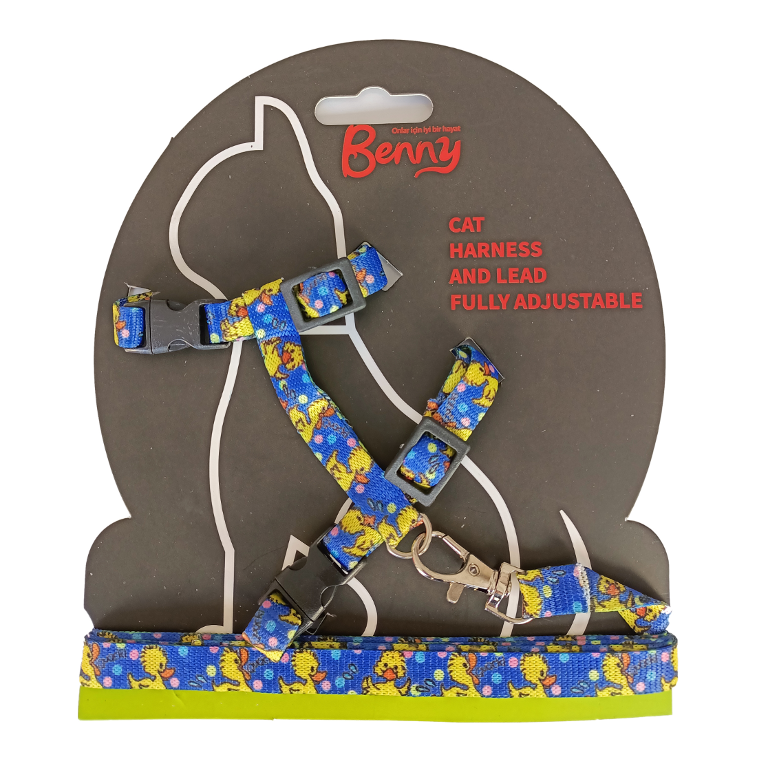 Üzerinde koyu mavi şerit üzerine ördek desenleri mevcut kedi göğüs tasması ve gezdirme kayışından oluşat gezdirme setidir.