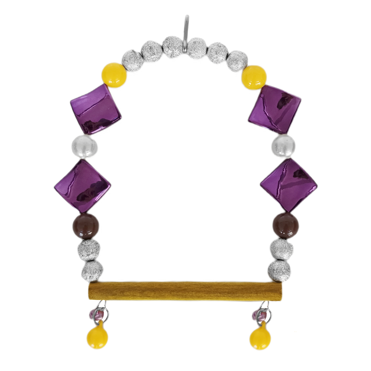 Markapet kuş salıncağı büyük mor boncuklu ve tünekli 10-16 cm. İri parlak boncuklarla ve çanla hazırlanan salıncak şık bir görünüme sahiptir. Kafes kuşlarının kafeslerinde sıkılmamaları için oyuncaklara ihtiyaçları vardır. Bu oyuncaklarla hoş bir vakit geçirebilirler. Simli parlak boncuklu ve çanlı kuş salıncağı kanatlı dostunuzun dikkatini kolayca çekebilecek bir oyuncak çeşididir. Metal askısı sayesinde kolayca sallanabilmesi hedeflenmiştir. Tüneğinin ahşap olması sayesinde ise kuşların çabuk uzayan tırnaklarının törpülenmesini ve sağlıklı uzamasını desteklemektedir. Oyuncaklar zihinsel egzersiz oluşturması açısından yararli olup fiziksel egzersize teşvik eder. Farklı oyuncaklar kullanmak kuşun ilgisinin çeker, bu sebeple dönem dönem oyuncak değişikliği yapılması kanatlı dostunuzun sıkılmasını ve bunalıma girmesini önleyecektir.