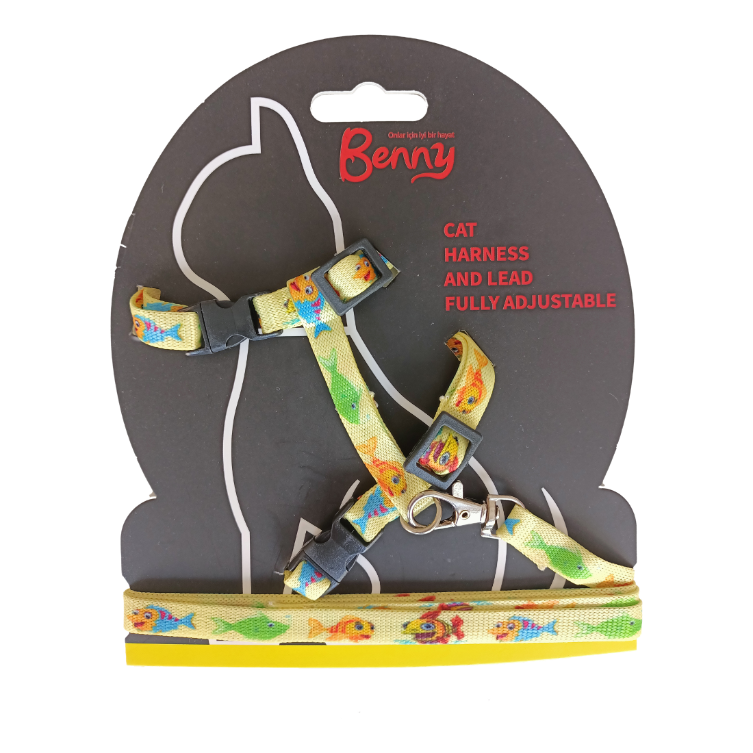 Üzerinde sarı yeşil şerit üzerine nemo balık desenleri mevcut kedi göğüs tasması ve gezdirme kayışından oluşat gezdirme setidir.