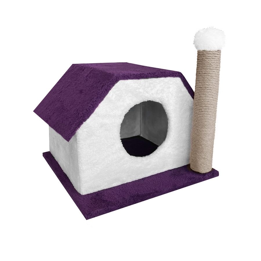 Yavru ve tetişkin kediler için uygundur. Canlı renklerde ve sağlam yapıdadır. Kulube ahşaptan yapılmış olup üzeri kaliteli peluşla kaplanmış ve konforlu hale getirilmiştir. Hem kulube hem de sevimli dostunuzun uzun tırnaklarını törpüleyecek bir tırmalama aparatına sahiptir. Tırmalama aparatı sağ ve sol balkon kısma takılabilir şekilde tasarlanmıştır. Sadece kulube şeklinde de kullanılabilir. Ağırdır ve kolay devrilmez. Tırmalama tahtasında jut halat kullanılmıştır. Kumaşı rahatlıkla silinebilen peluş kumaştır. Canlı renkleri ve şık görünümü sayesinde evinizin köşesinde hoş bir ambiyans oluşturacaktır. Mor ve beyaz rengin kombinasyonu ile tasarlanmış tırmalamalı kedi evidir.