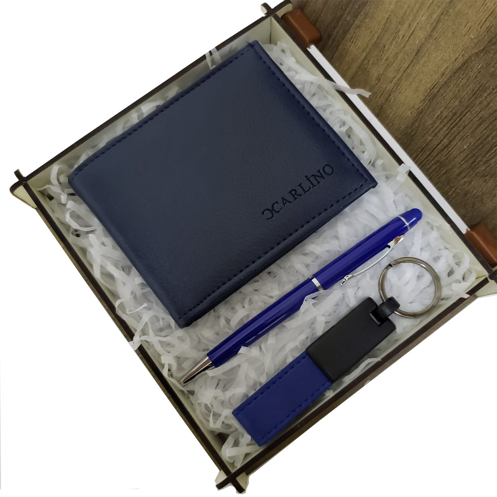 Mavi Cüzdan Kalem ve Deri Mavi Anahtarlık Set