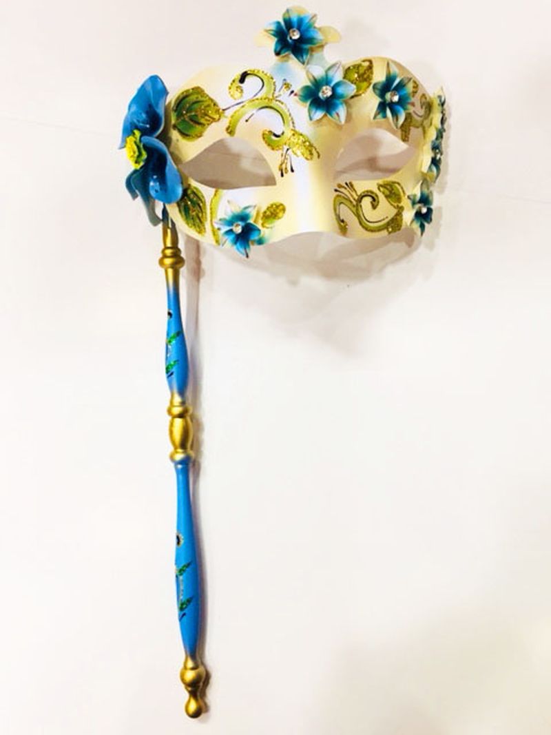 Mavi Renk Çiçek İşlemeli Tutmalı Venedik Göz Maskesi 33x17 cm