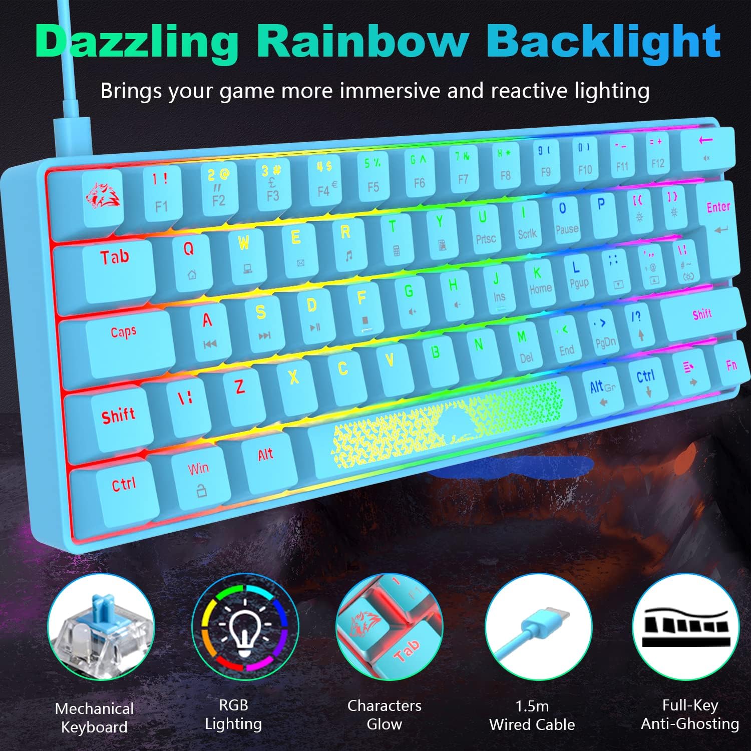 Küçük boyut, büyük işlev, tüm işlevleri %60 klavyeye sıkıştırdı. Yüksek taktik geri bildirim ve net "klik" sesi sağlamak için klasik mavi anahtarla donatılmış, 50 milyona kadar tıklanabilir, ayrıca mükemmel dokunma hassasiyeti ve tepkisi, size hızlı tıklama geri bildirimi sağlar.
