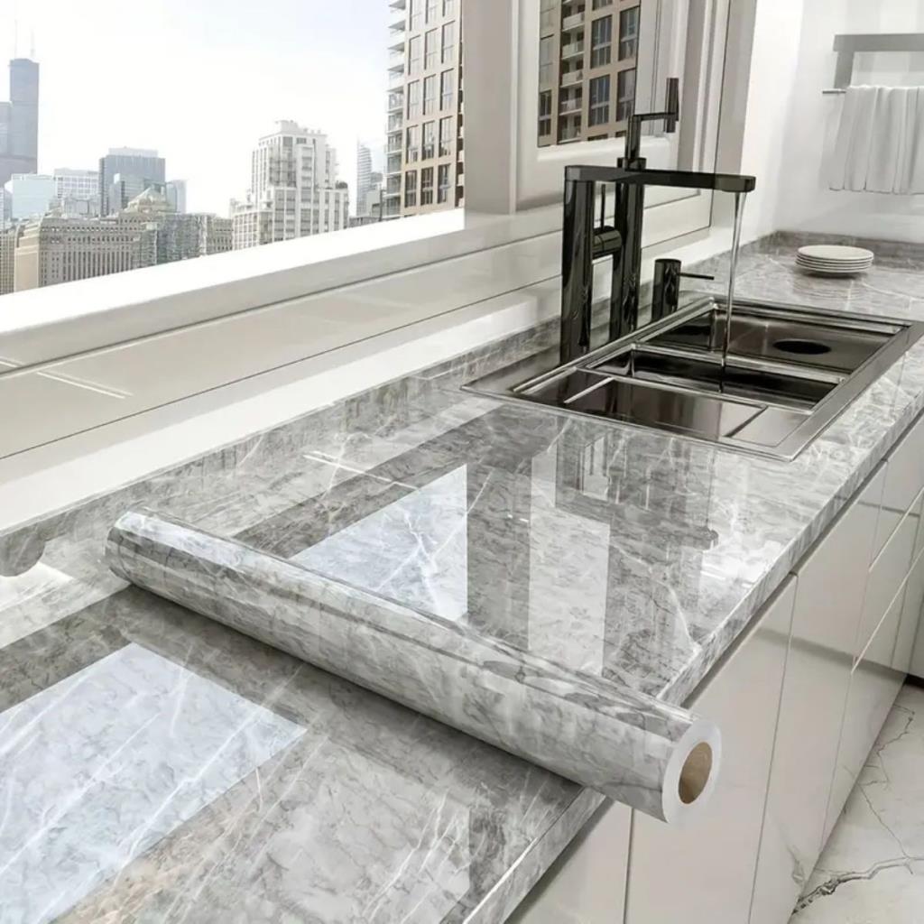 Atina Grisi mermer deseniyle yaşam alanlarınıza modern ve zarif bir hava katmak için ideal olan bu folyo, dekorasyona şıklık katarken ekonomik bir yenileme çözümü sunar.