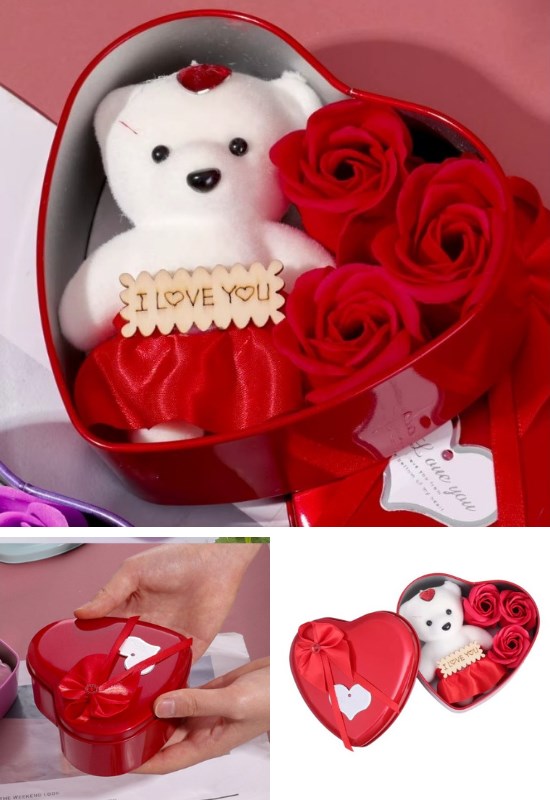 Metal Kalp Kutuda Sevgiliye Hediye Mini Ayıcık ve 3 Yapay Gül Hediye Kutusu
