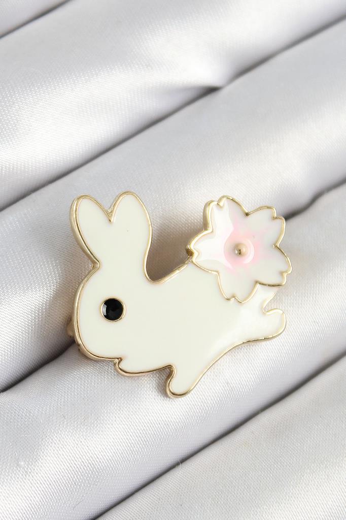 Mineli Çiçek Detaylı Krem Tavşan Figürlü Gold Renk Kadın Broş - BR452