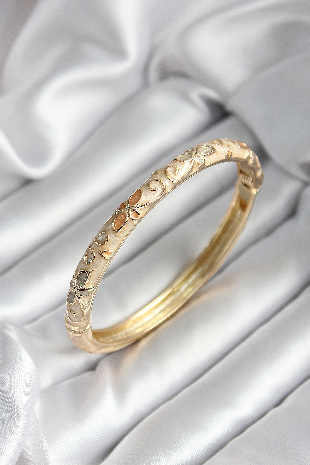 Mineli Pirinç Bej Çiçek Desenli Gold Renk Kadın Kelepçe (çap 60 mm) - TJ-BB7001