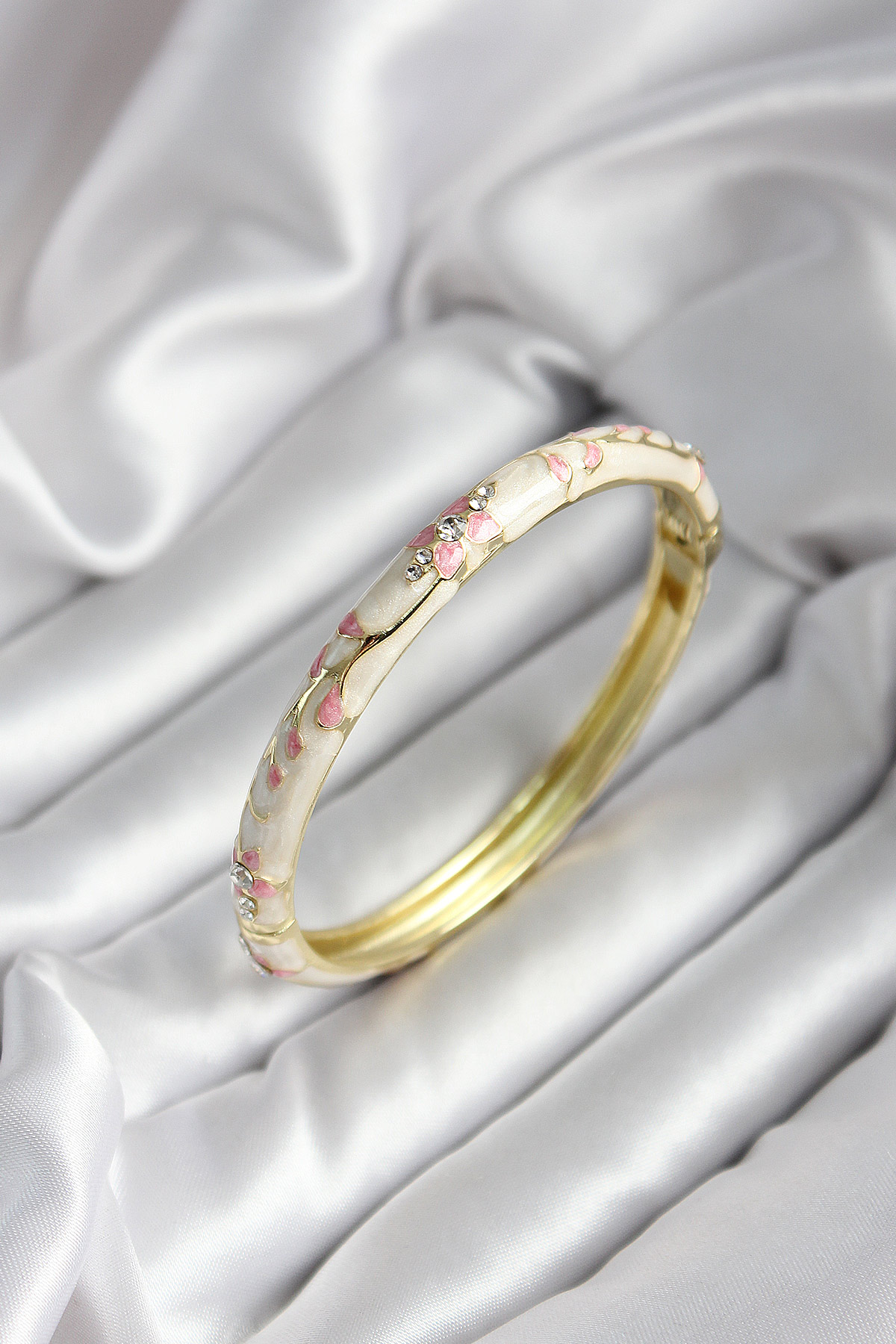 Mineli Pirinç Bej Çiçek Desenli Zirkon Taşlı Gold Renk Kadın Kelepçe (çap 60 mm) - TJ-BB6992