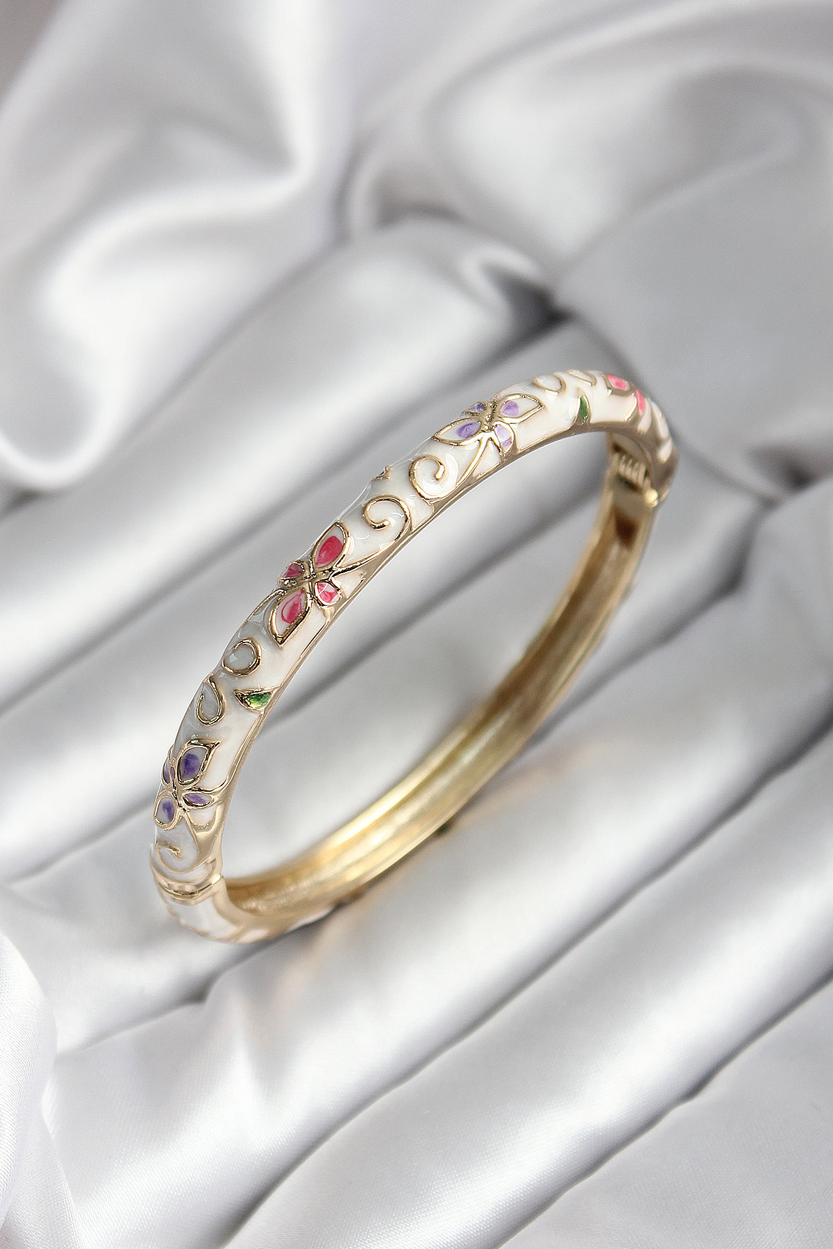 Mineli Pirinç Beyaz Çiçek Desenli Gold Renk Kadın Kelepçe (çap 60 mm) - TJ-BB7003