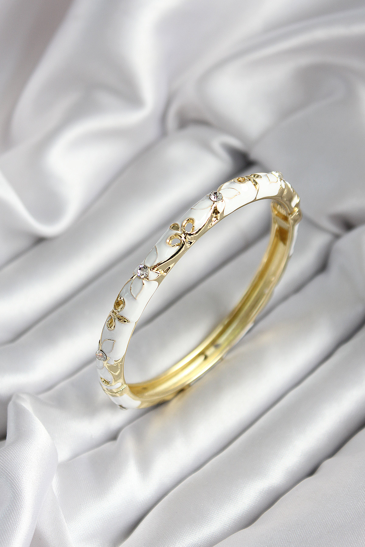 Mineli Pirinç Beyaz Çiçek Desenli Zirkon Taşlı Gold Renk Kadın Kelepçe (çap 60 mm) - TJ-BB6988