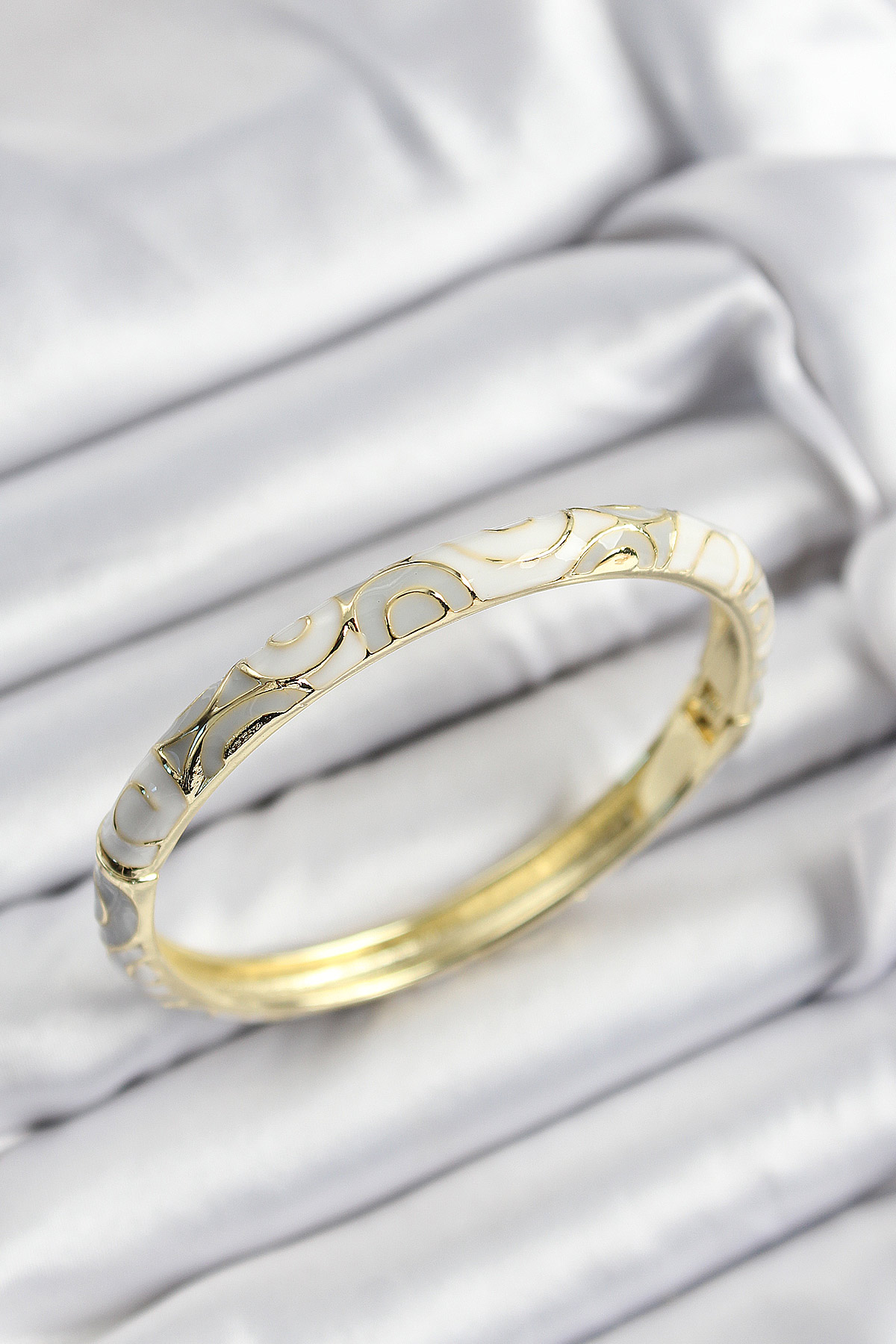 Mineli Pirinç Beyaz Ve Gri Sarmal Motifli Gold Renk Kadın Kelepçe - TJ-BB7420