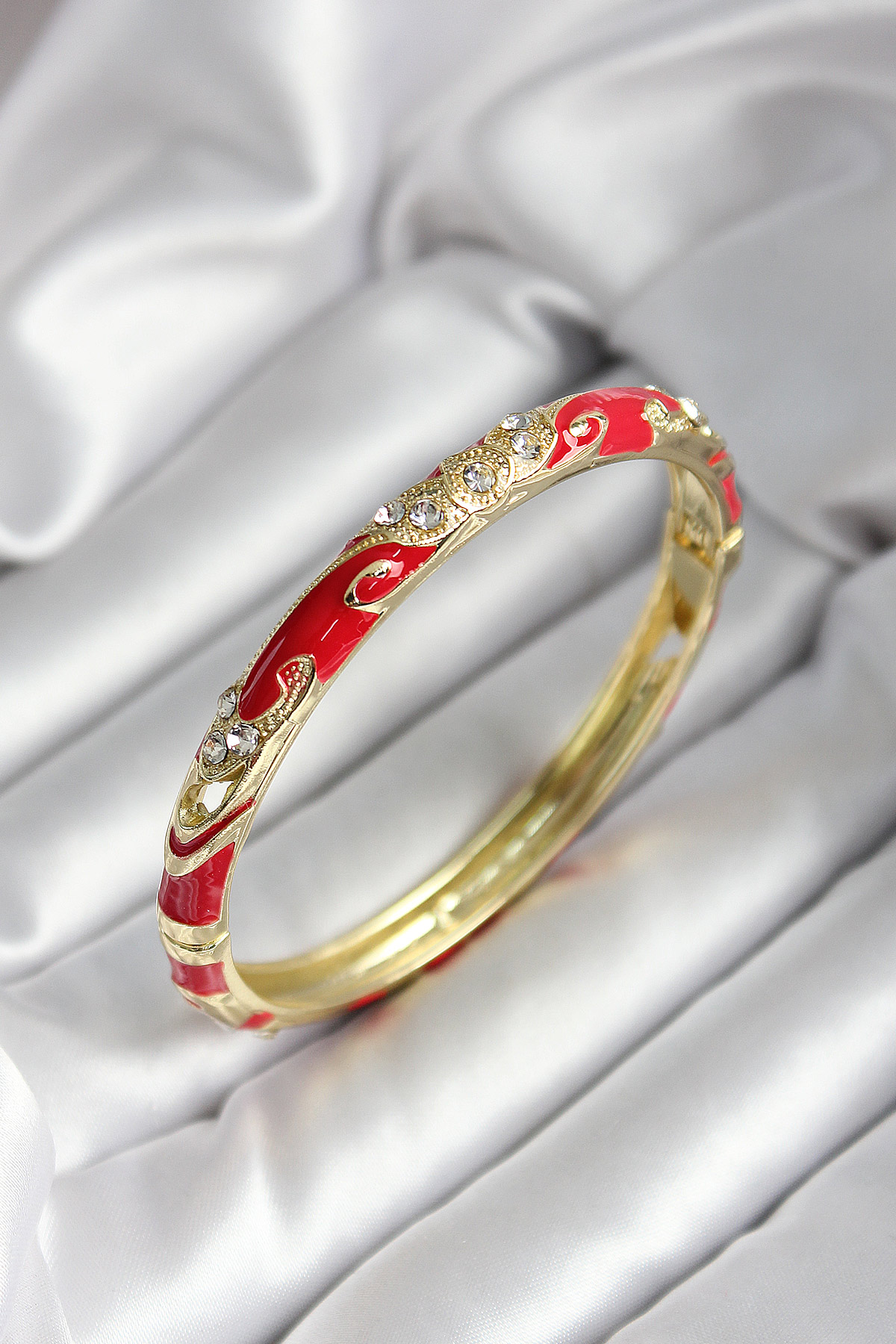 Mineli Pirinç Kırmızı Çiçek Desenli Zirkon Taşlı Gold Renk Kadın Kelepçe - TJ-BB7009
