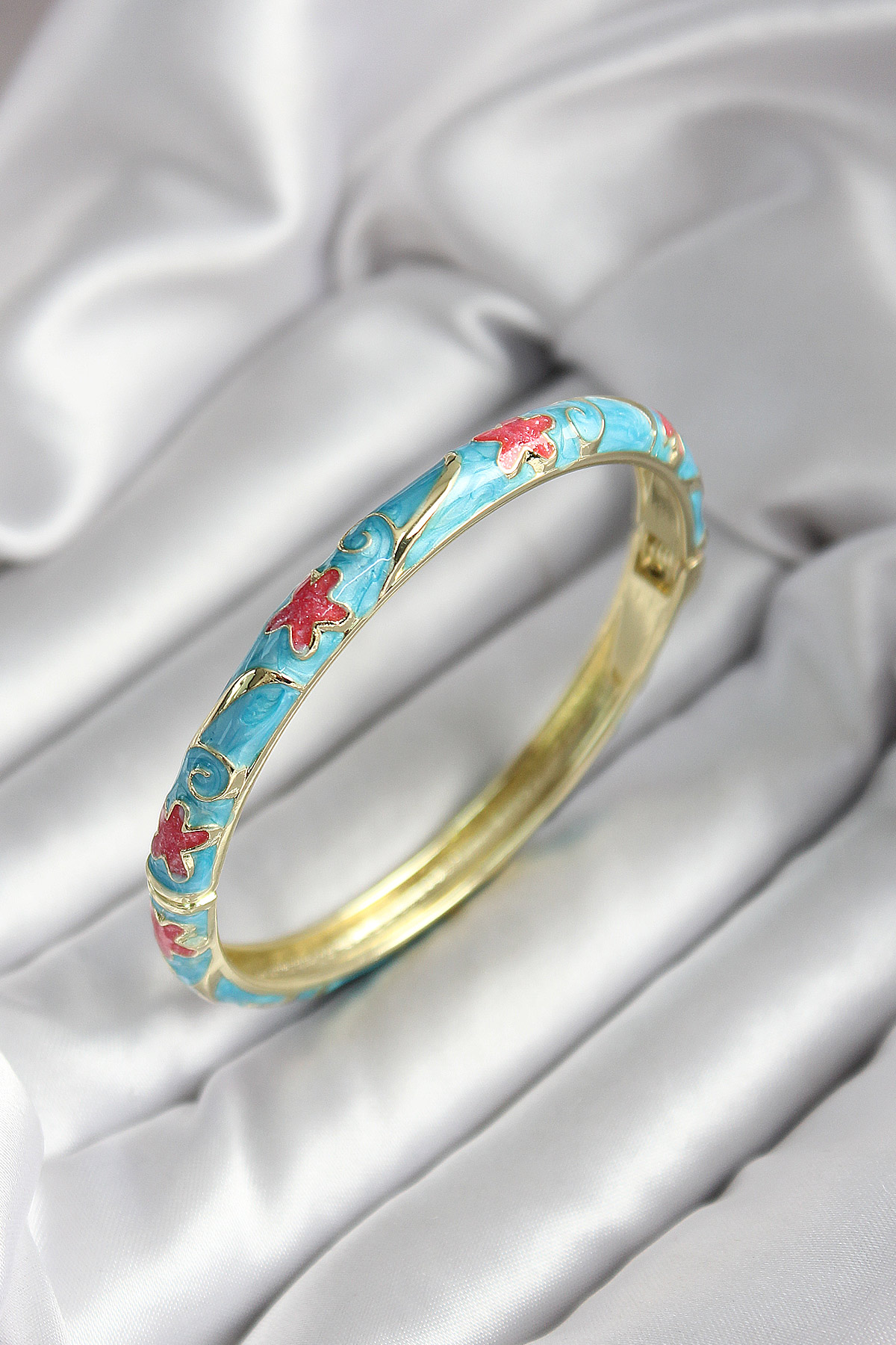 Mineli Pirinç Mavi Çiçek Desenli Gold Renk Kadın Kelepçe (çap 60 mm) - TJ-BB6995