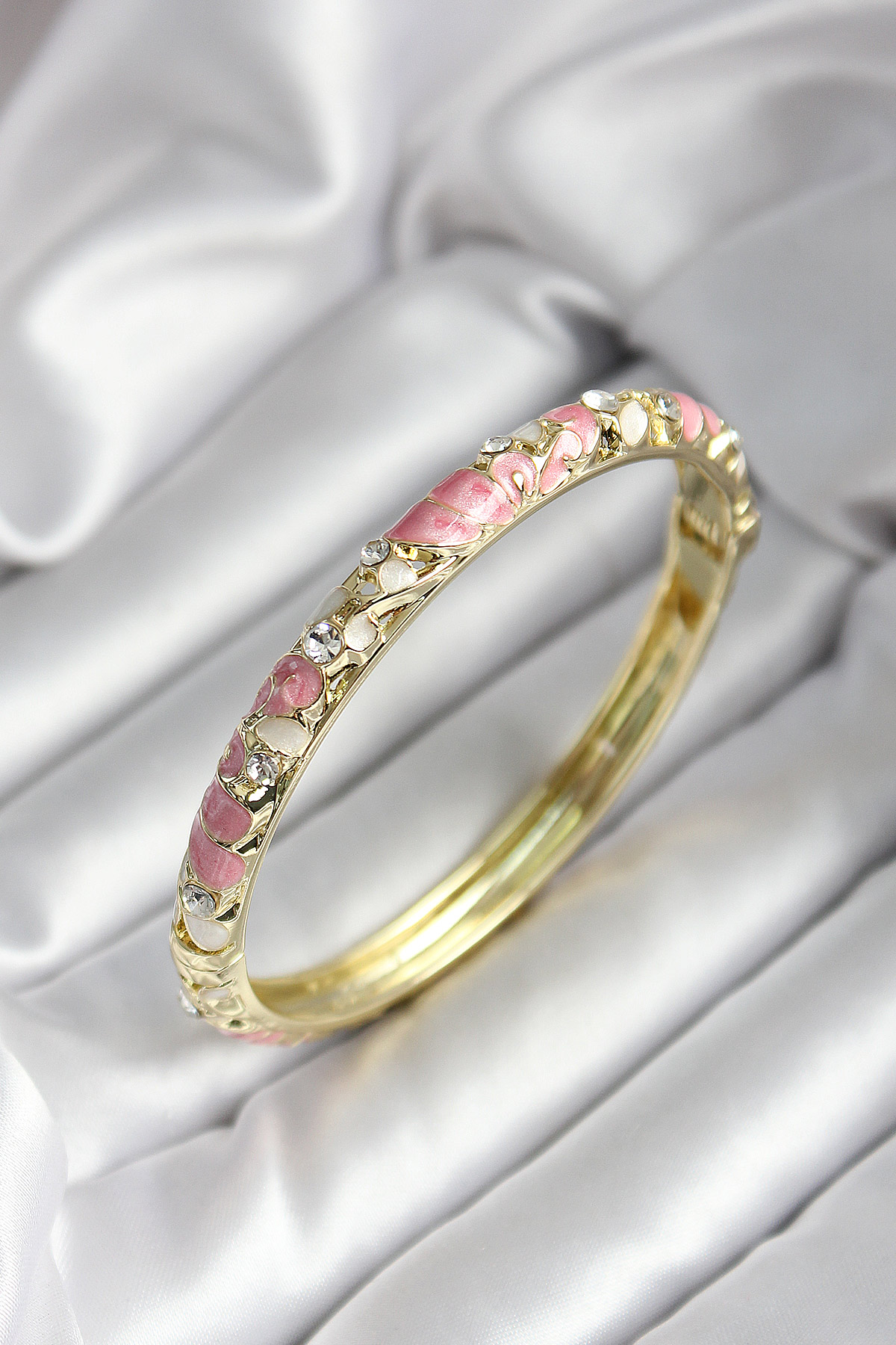 Mineli Pirinç Pembe Çiçek Desenli Zirkon Taşlı Gold Renk Kadın Kelepçe - TJ-BB7013