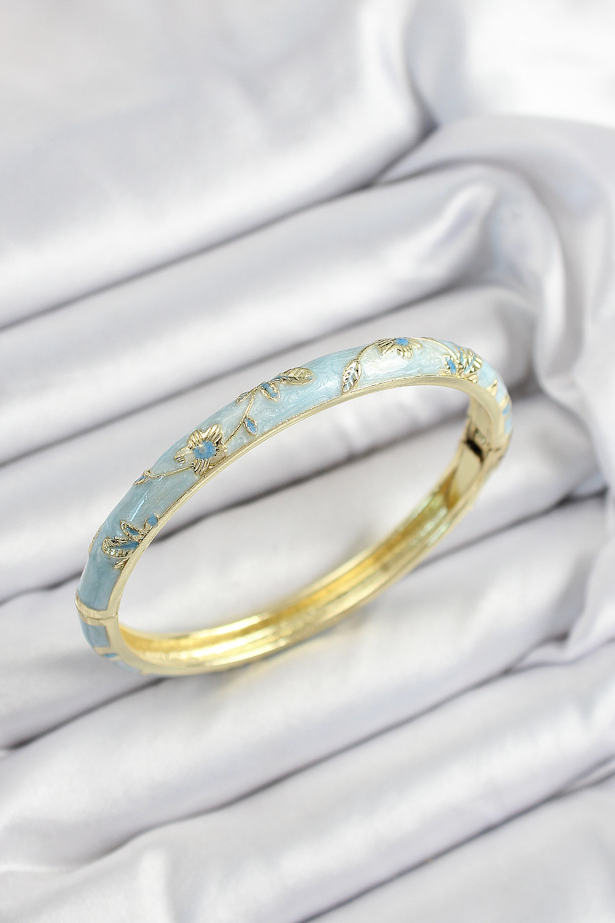 Mineli Pirinç Turkuaz Çiçek Motifli Gold Renk Kadın Kelepçe - TJ-BB7437