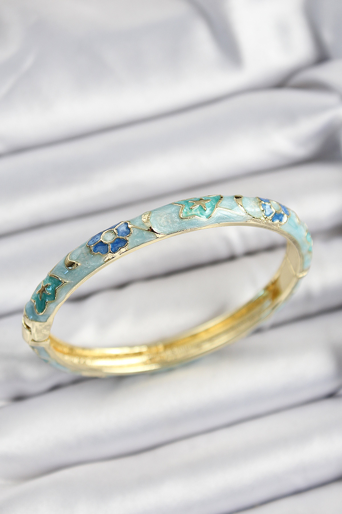Mineli Pirinç Turkuaz Ve Mavi Çiçek Motifli Gold Renk Kadın Kelepçe - TJ-BB7367