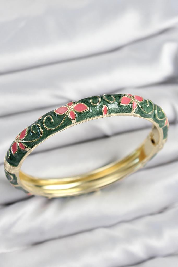 Mineli Pirinç Yeşil Çiçek Motifli Gold Kadın Kelepçe - BB7634