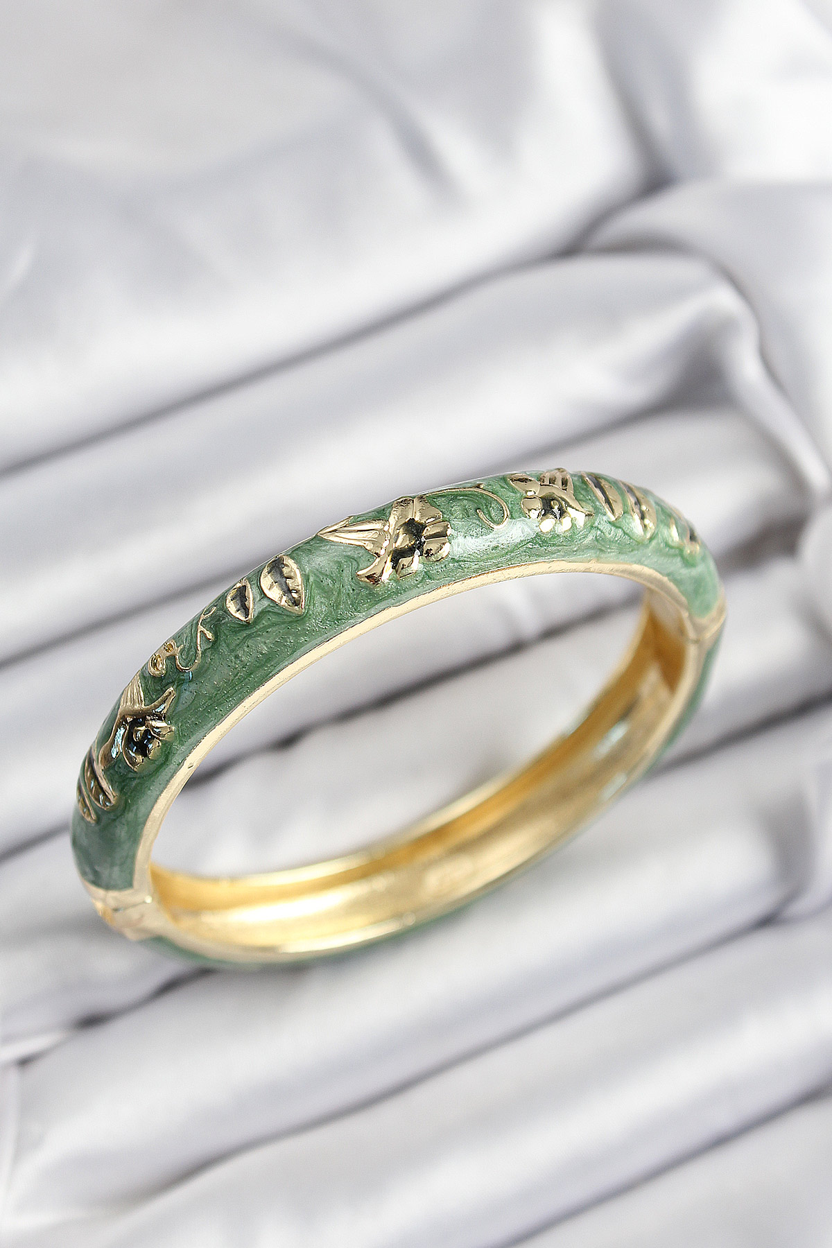 Mineli Pirinç Yeşil Çiçek Motifli Gold Renk Kadın Kelepçe - TJ-BB7378