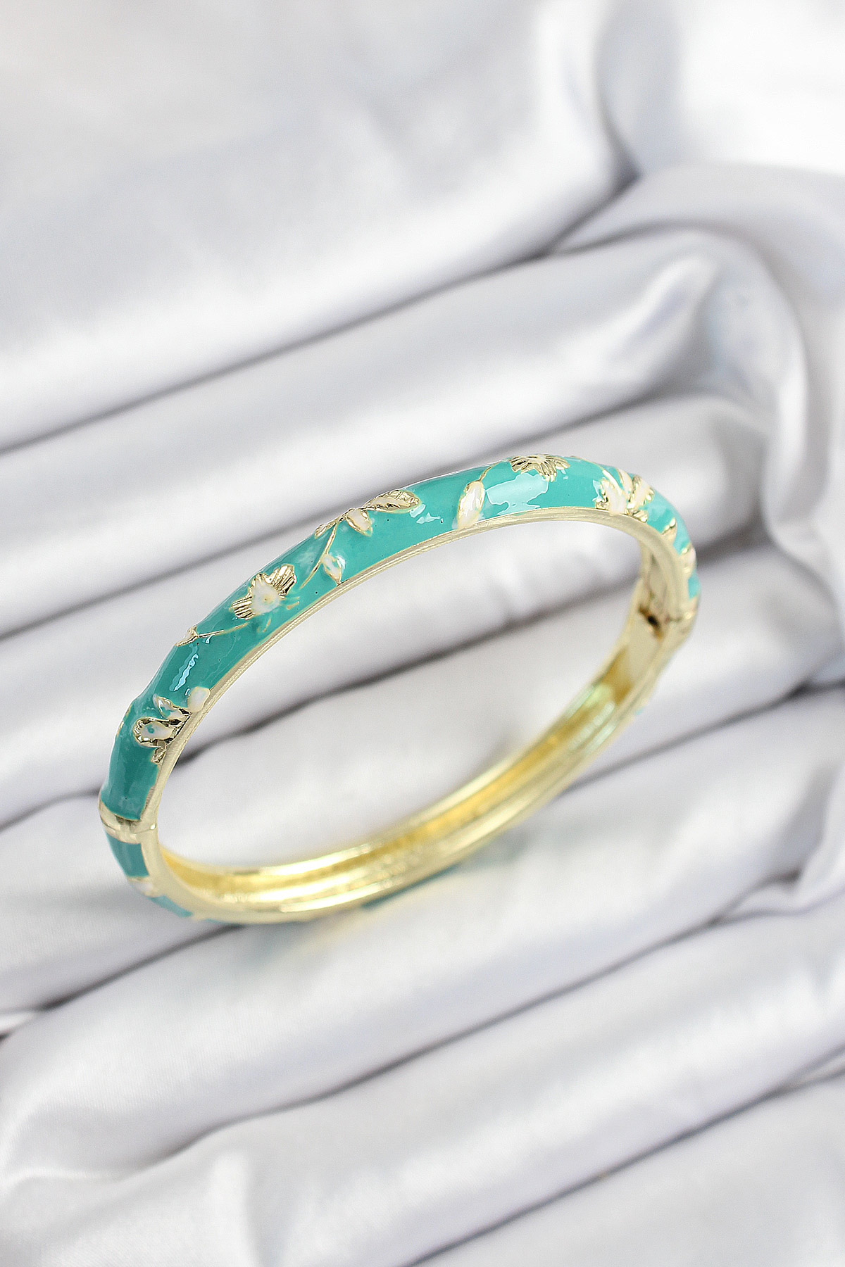 Mineli Pirinç Yeşil Çiçek Motifli Gold Renk Kadın Kelepçe - TJ-BB7442