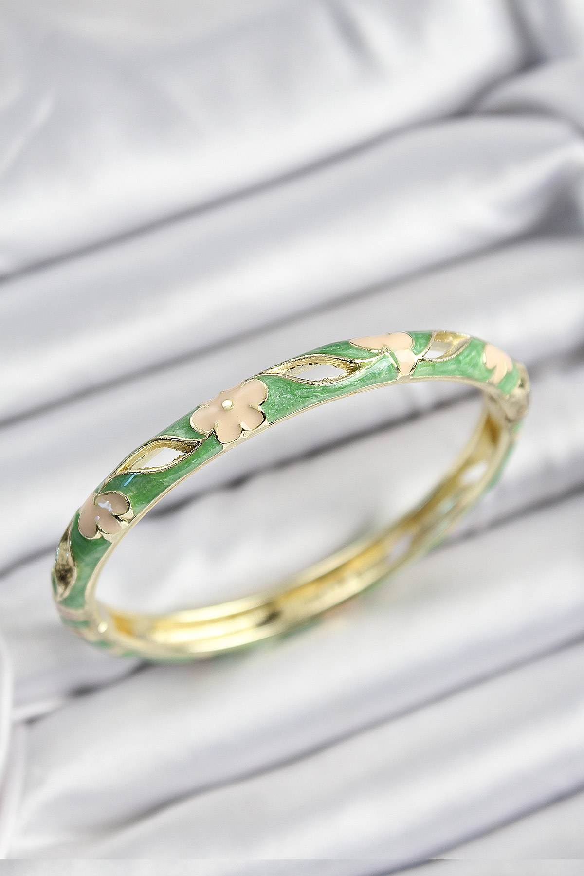 Mineli Pirinç Yeşil Ve Krem Çiçek Motifli Gold Renk Kadın Kelepçe - TJ-BB7371