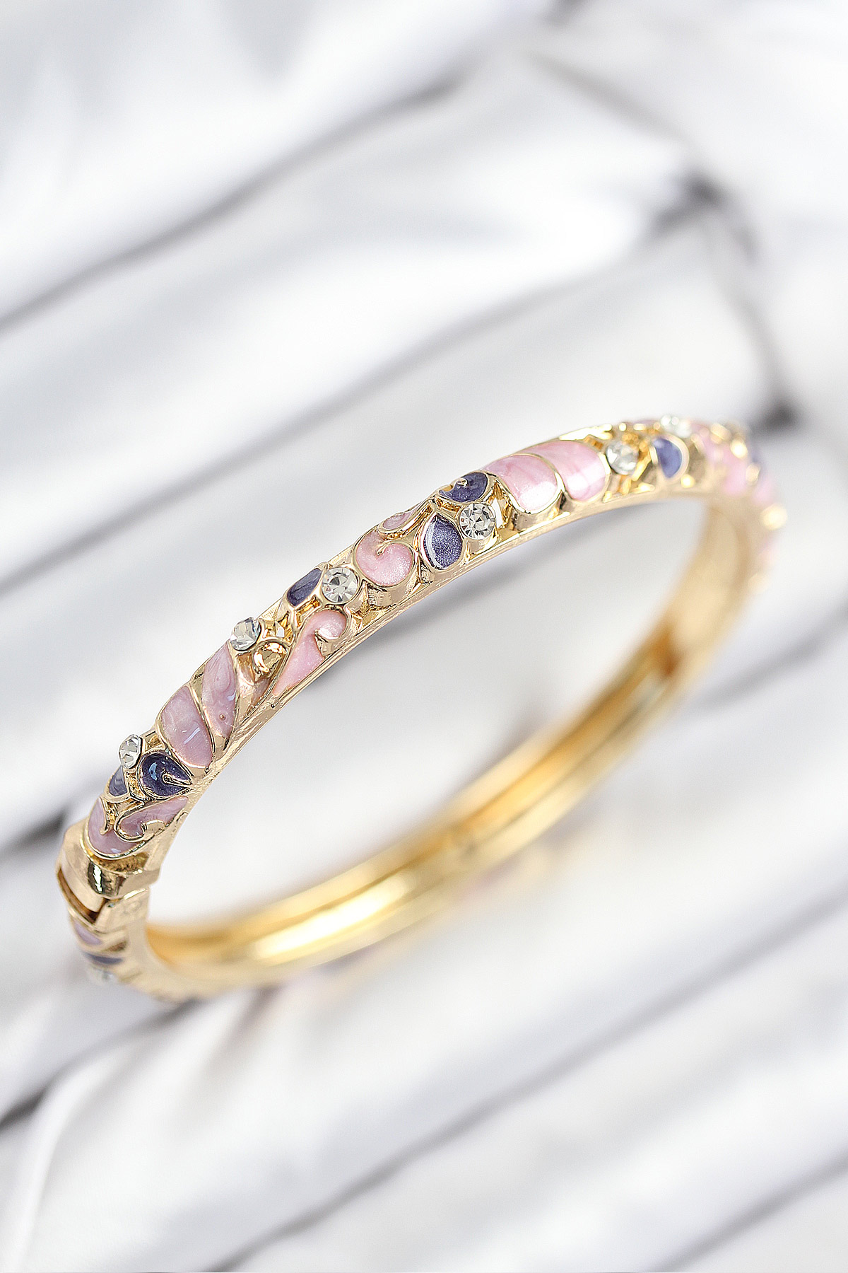 Mineli Pirinç Zirkon Taşlı Fuşya Mor Çiçek Motifli Gold Kadın Kelepçe - TJ-BB7815