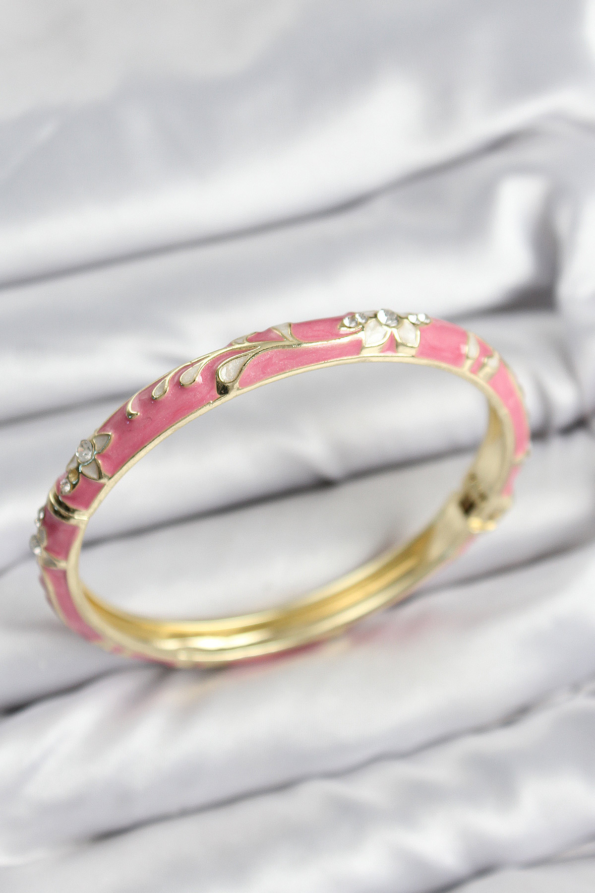 Mineli Pirinç Zirkon Taşlı Pembe Çiçek Motifli Gold Kadın Kelepçe - TJ-BB7626