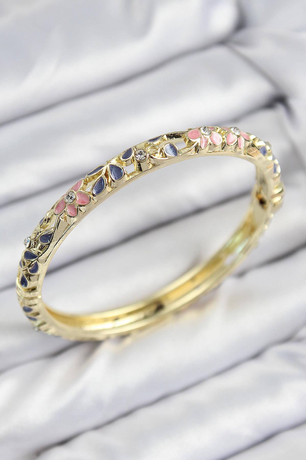 Mineli Pirinç Zirkon Taşlı Pembe Mor Çiçek Motifli Gold Kadın Kelepçe - BB7755
