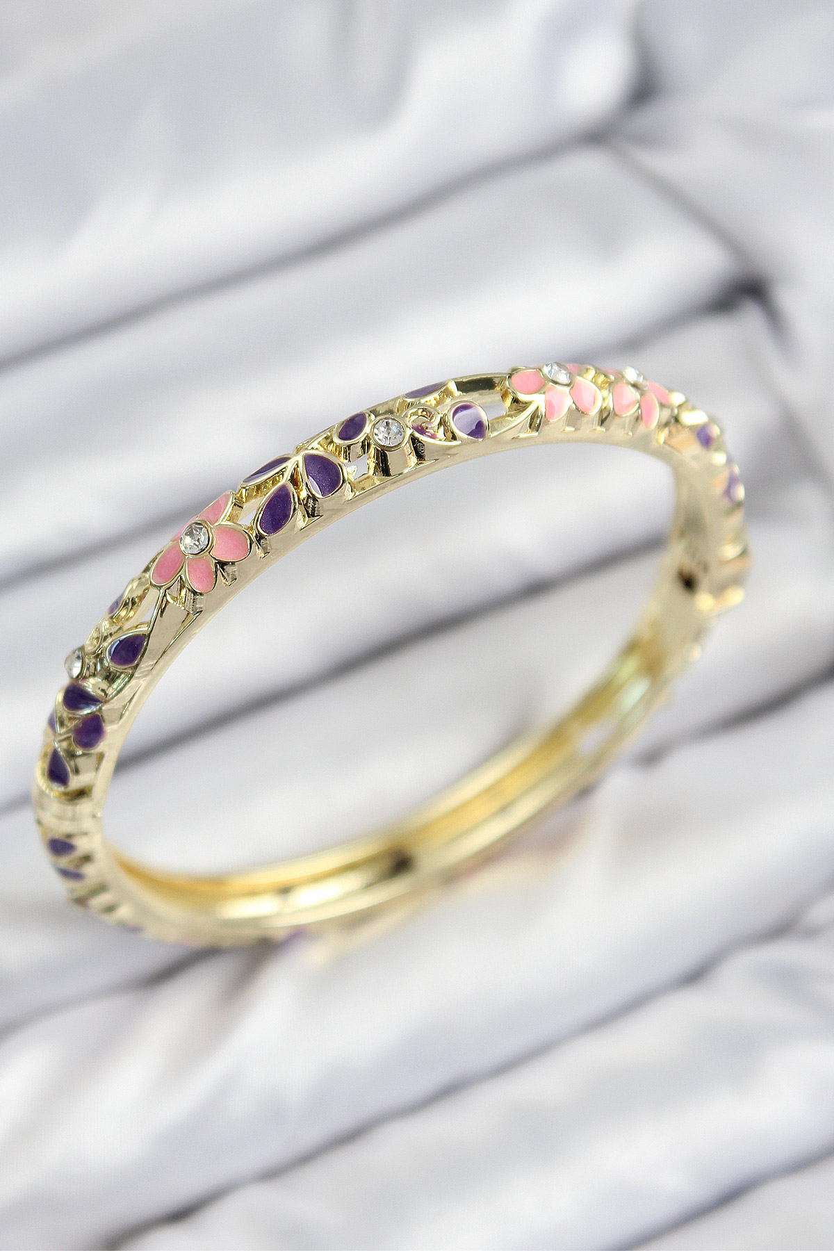 Mineli Pirinç Zirkon Taşlı Pembe Mor Çiçek Motifli Gold Kadın Kelepçe - TJ-BB7750