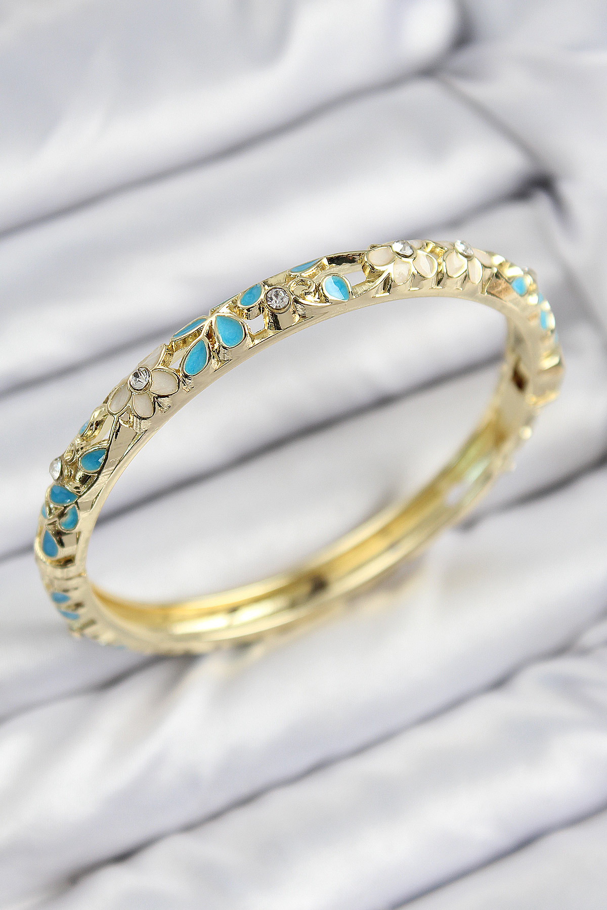 Mineli Pirinç Zirkon Taşlı Turkuaz Krem Çiçek Motifli Gold Kadın Kelepçe - TJ-BB7751