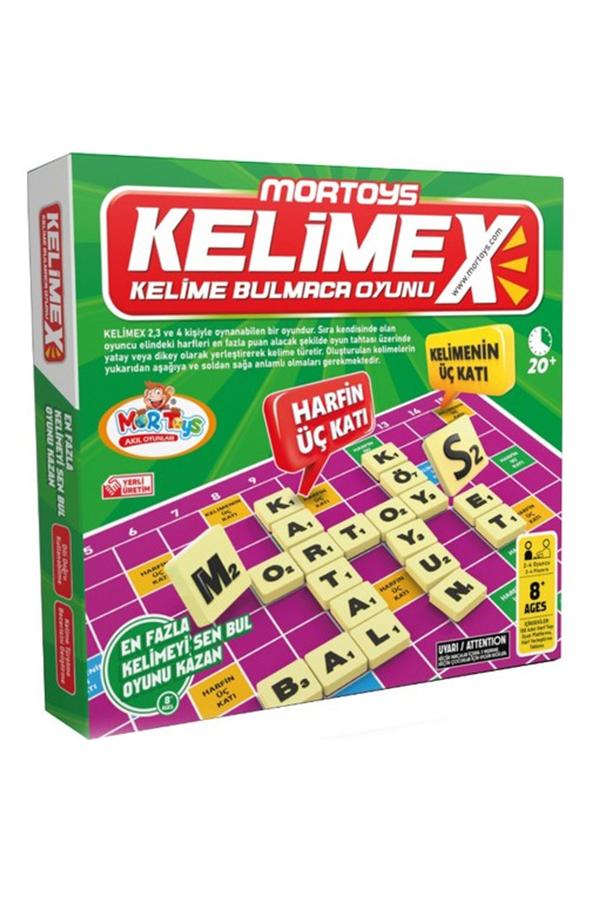 | Mor Toys Kelimex, Kelime Bulmaca Oyunu - Ürün Kodu : MOR.9708 Kelimex 2,3 ve 4 kişiyle oynanabilen bir oyundur. Oyunda alfabemizdeki 29 harf ve 2 adet de bu harflerden herhangi biri yerine kullanabileceğiniz Joker harf bulunmaktadır. Joker harfler dışındaki tüm harflerin bir puan değeri vardır. Sıra kendisinde olan oyuncu elindeki harfleri en fazla puan alacak şekilde oyun tahtası üzerinde yatay veya dikey olarak yerleştirerek kelime türetir. Oluşturulan kelimelerin yukarıdan aşağıya ve soldan sağa anlamlı olmaları gerekmektedir. Kelimelik 15x15 hücrelik bir oyun tahtası üzerinde oynanır. Oyunda toplam 100 adet harf bulunmaktadır. Yerdeki taşlar bitene kadar oyunculara her tur 7 adet harf verilir. Yerdeki harfler bittikten sonra elindeki harfleri de bitiren oyuncu ile birlikte oyun biter. Toplamda en fazla puanı sahip oyuncu galip sayılır. |