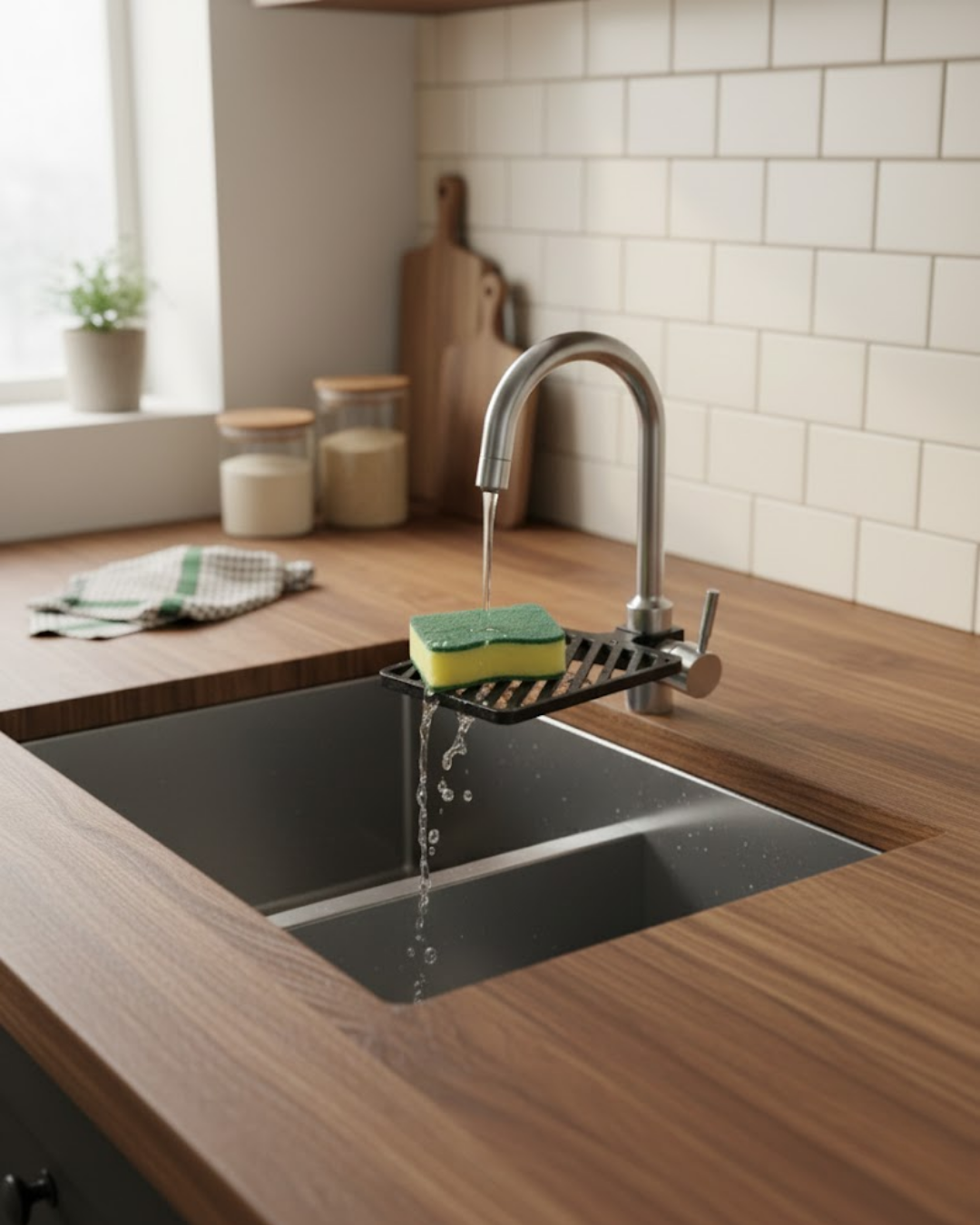 Ürün, musluğun gövdesine monte edilmiş birleşik tasarımıyla dikkat çeker. Ayrı bir aparat gibi durmaz; musluğun doğal bir parçasıymış gibi estetik bir bütünlük sağlar. Platform yapısı sayesinde sünger dengeli şekilde durur ve kayma yapmaz. Alt kısmındaki drenaj kanalları, yıkama sonrası süngerden akan suyun lavaboya yönlendirilmesini sağlar ve süngerin daha kısa sürede kurumasına yardımcı olur.