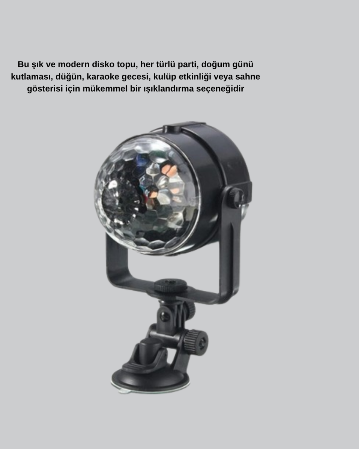 Partilerin enerjisini artırmak için tasarlanmış bu müzik ritmine duyarlı disko topu, 7 farklı renk modu ile ortamınıza büyüleyici bir atmosfer katar. Kırmızı, yeşil, mavi gibi temel renklerin yanı sıra bu renklerin karışımıyla oluşan dinamik ışık efektleri, her türlü partiye renk getirir. Müzik ritmine duyarlı entegre sensör, ses dalgalarını algılayarak ışıkların müziğin temposuna göre yanıp sönmesini sağlar. Böylece ışıklar müzikle uyum içinde hareket eder, dans pistinde eğlenceyi zirveye taşır. Ev partileri, doğum günü kutlamaları, düğünler, karaoke geceleri, kulüpler veya sahne etkinlikleri için mükemmel bir tercihtir. Enerji tasarruflu LED sistemi uzun ömürlü kullanım sunarken, düşük ısı üretimiyle güvenli bir deneyim sağlar. Hafif ve kompakt yapısı sayesinde kolay taşınabilir. Modern tasarımıyla sadece ışık değil, aynı zamanda dekoratif bir obje olarak da dikkat çeker.