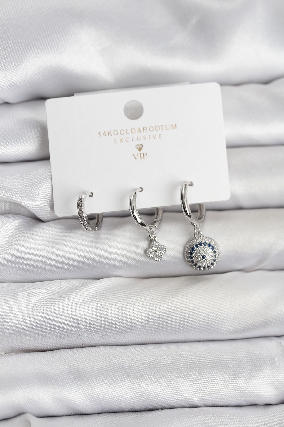 Nazar Model Gümüş Renk Pirinç 3'lü Kadın Küpe Seti - TJ-BKP11442