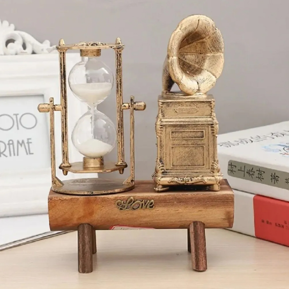 Nostaljik Kum Saati'nin Yanında Bulunan Gramafon Dekoru Ile Kum Saati Farklı Tasarıma Sahip Olmuştur.