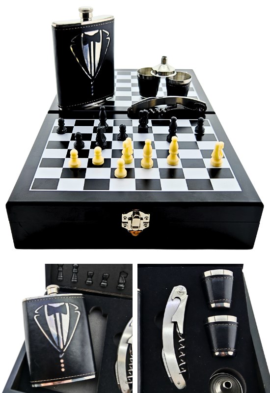 • Sevdikleriniz için ya da kendiniz için güzel ve kaliteli bir set İçerik: Satranç tahtalı Ahşap Kutusu, Paslanmaz çelik matara, 2 adet Shot bardağı, Matara hunisi, Çok işlevli çakı, Satranç Takımı.