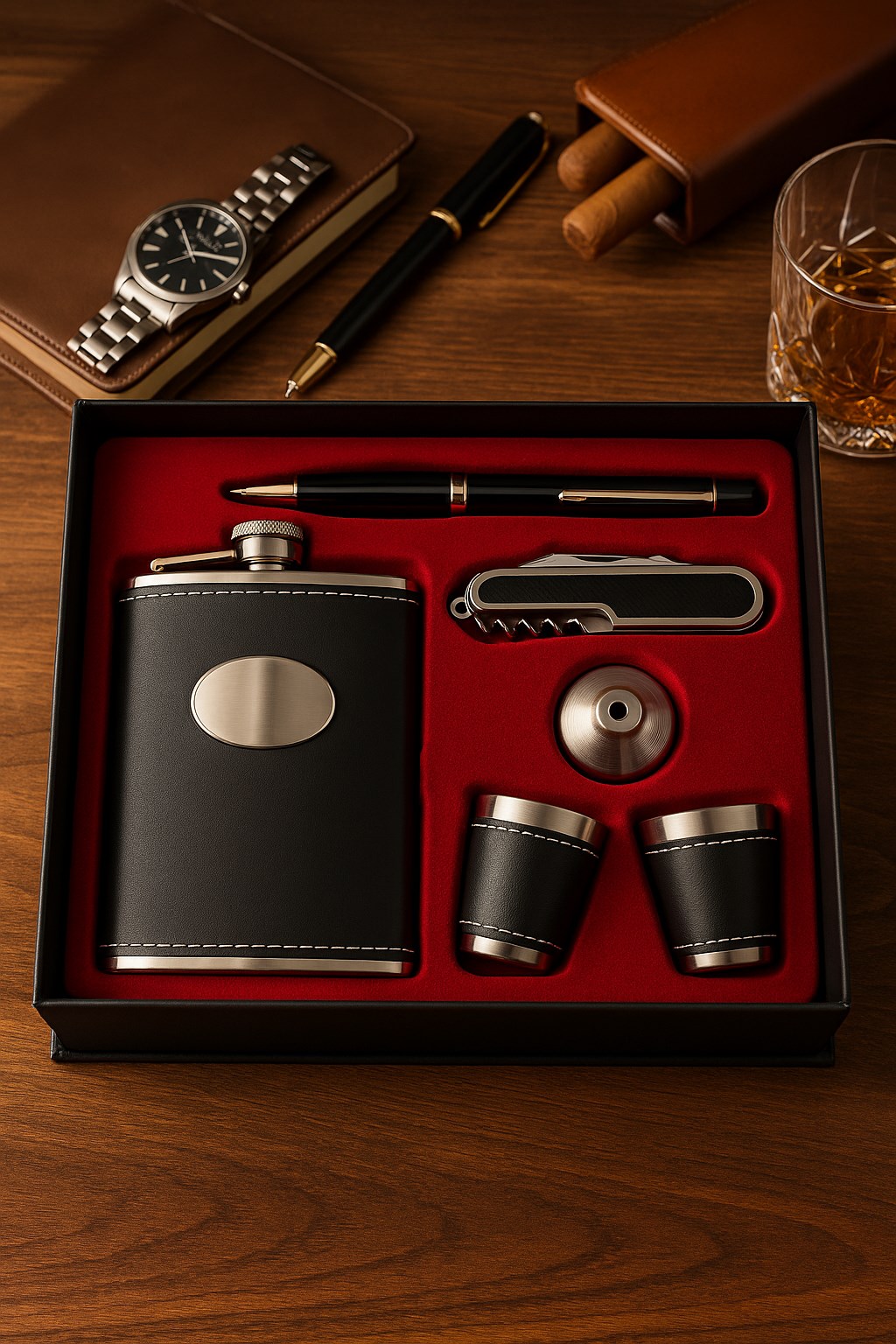 ✅ 1 Adet Deri Kaplamalı Çelik Matara: 7 oz (yaklaşık 210 ml) kapasite, sızdırmaz kapaklı.