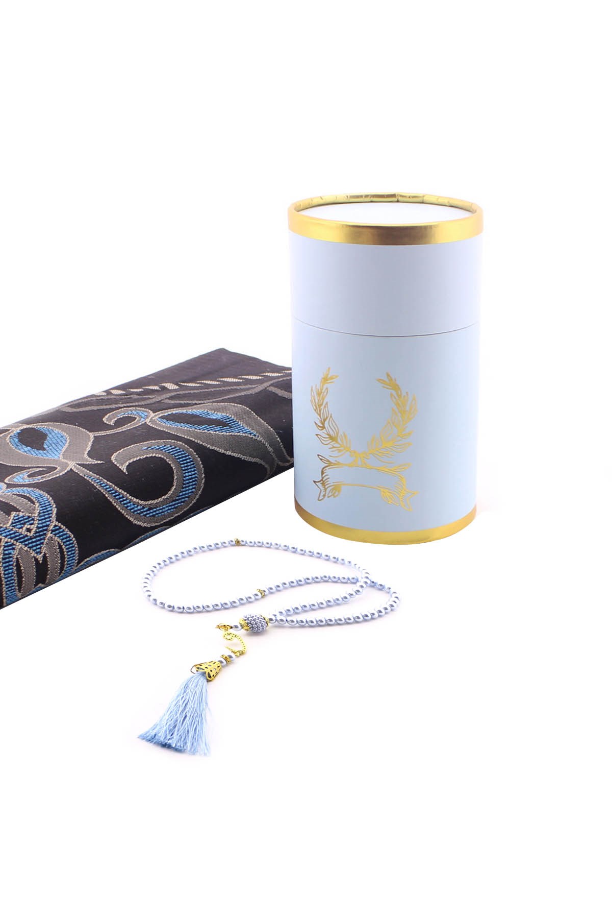 Özel Silindir Kutuda Tafta İpek Seccade ve İnci Tesbih Lüks Set Mavi