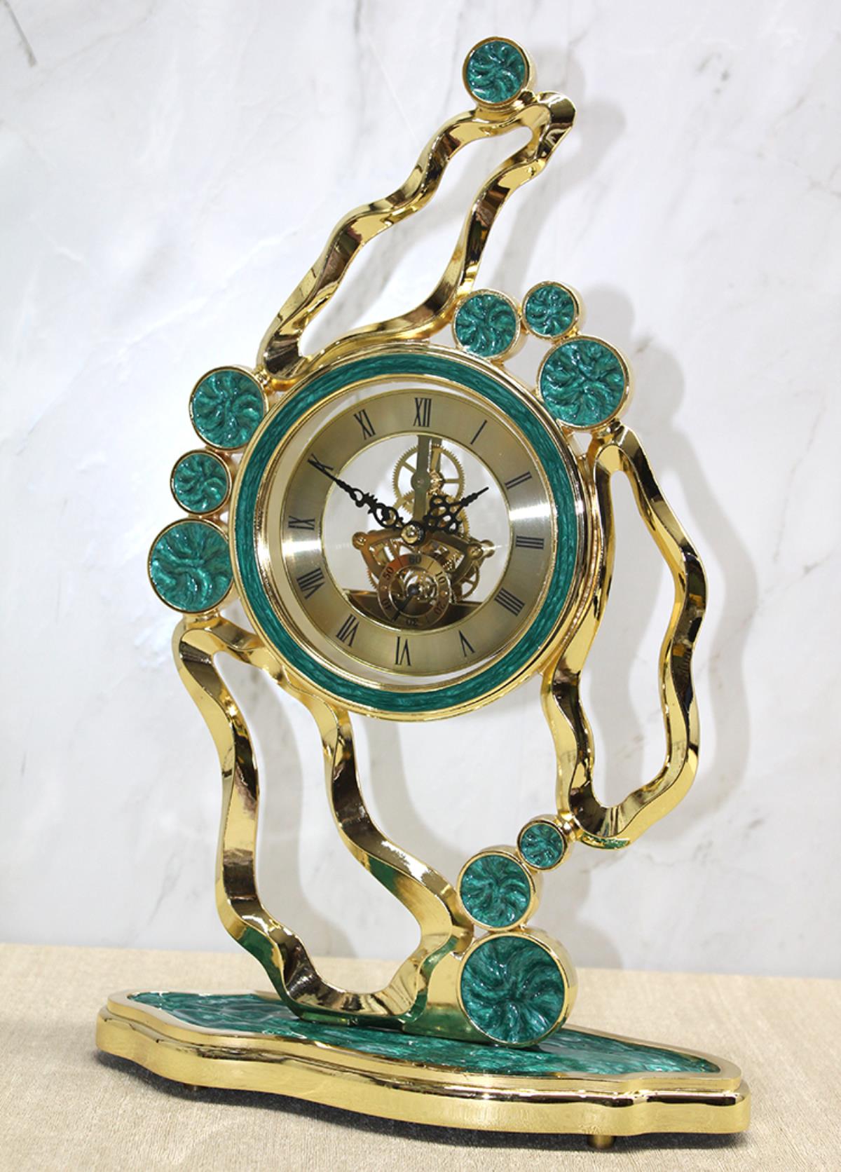 ÖZEL YEŞİM TASARIM MASA ÜSTÜ SAAT  Ürün Özellikleri Özel yeşim tasarımlı masa üstü saat, zarif görünümüyle dekoratif ve işlevsel bir parça sunar. Altın tonları ile yeşilin uyumunu yansıtan şık tasarımı, hem klasik hem de modern dekorasyonlarla uyum sağlar. 41x27 cm ölçüleri sayesinde masa üstünde dikkat çekici bir obje olurken aynı zamanda zamanı takip etmenizi kolaylaştırır. Kaliteli malzemeden üretilmiş olup uzun süreli kullanım için idealdir. Evinize, ofisinize ya da sevdiklerinize hediye olarak tercih edilebilecek özel bir dekoratif aksesuardır. Paket İçeriği 1 adet Özel Yeşim Tasarım Masa Üstü Saat