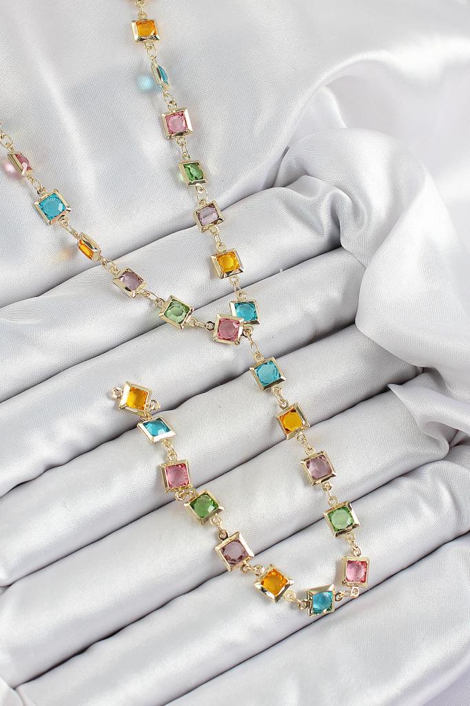 Pirinç Asorti Kare Model Gold Renk Zirkon Taşlı Y Kolye - BKO10253