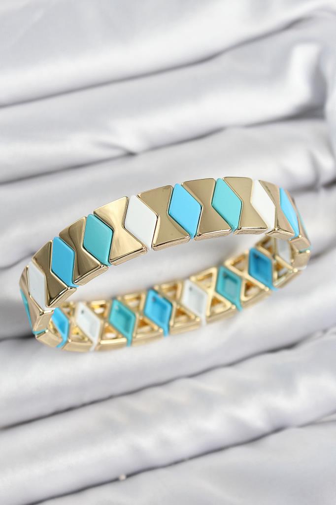 Pirinç Baklava Desenli Mavi Beyaz Gold Renk Lastikli Kadın Bileklik - BB7643