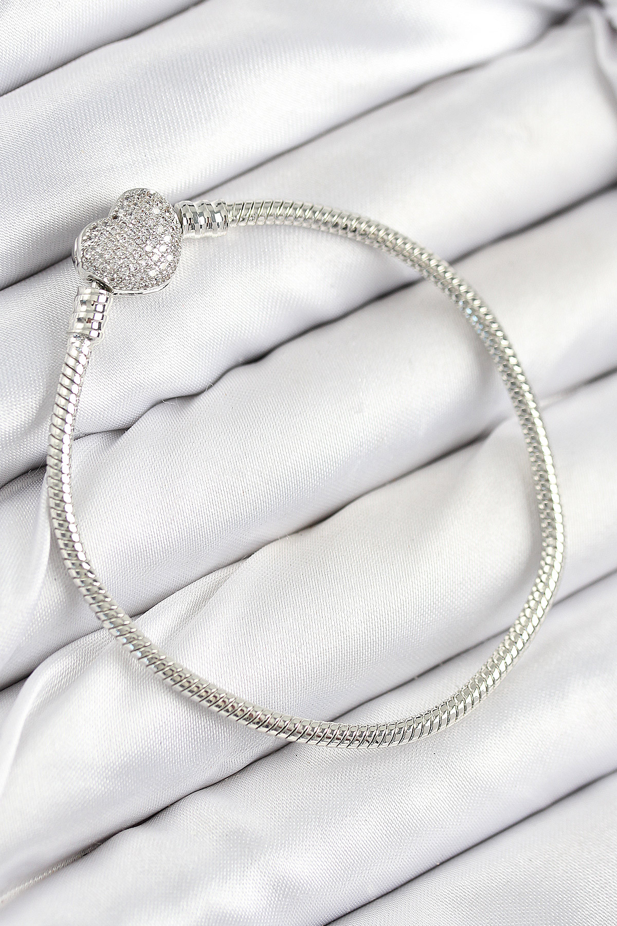 Pirinç Charm Zirkon Taşlı Kalp Model Gümüş Renk Kadın Bileklik - TJ-BB7803