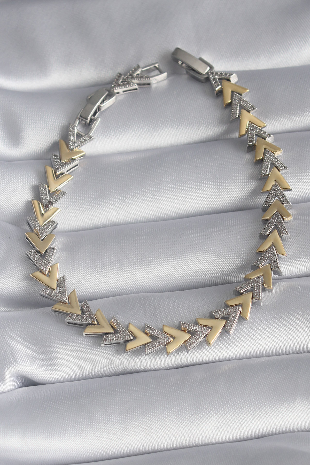 Pirinç Gold Gümüş Renk Zirkon Taş Detay V Model VIP Seri Kadın Bileklik - TJ-BB5864