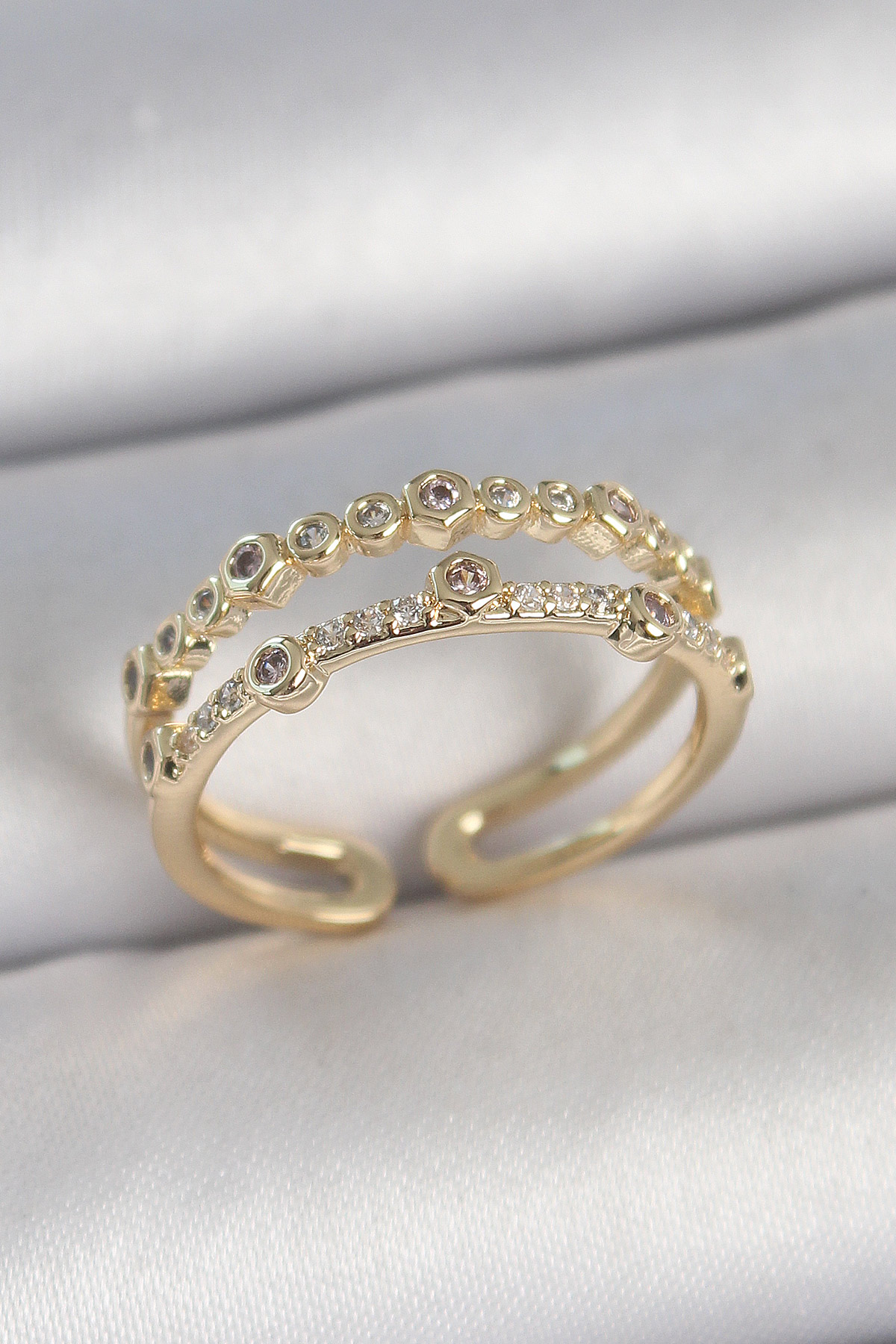 Pirinç Gold Renk 2'Li Sıralı Zirkon Taşlı Ayarlanabilir Model Kadın Yüzük - TJ-BYK3743
