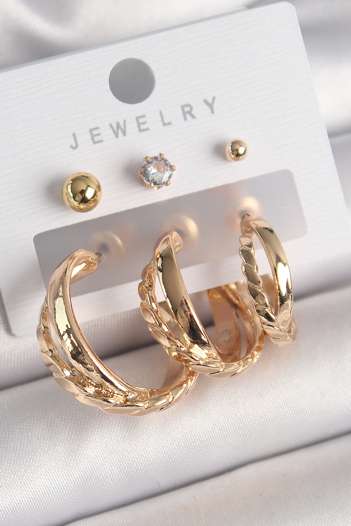 Pirinç Gold Renk 3'Lü Halka Model Zirkon Taş Topçuk Model Kadın Küpe Seti - TJ-BKP10312