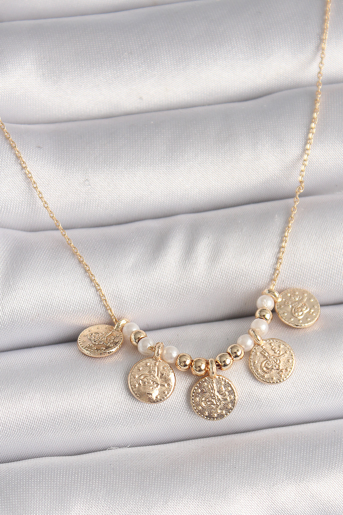 Pirinç Gold Renk 5'Li Osmanlı Tuğra Figür İnci Detay Kadın Kolye - TJ-BKO9825
