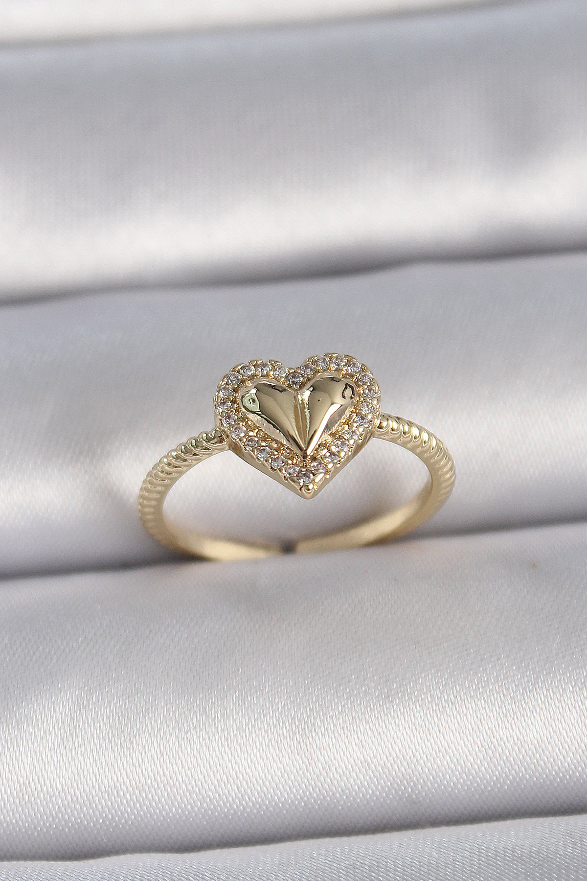 Pirinç Gold Renk Ayarlanabilir Zirkon Taşlı Kalp Model Kadın Yüzük - TJ-BYK3394