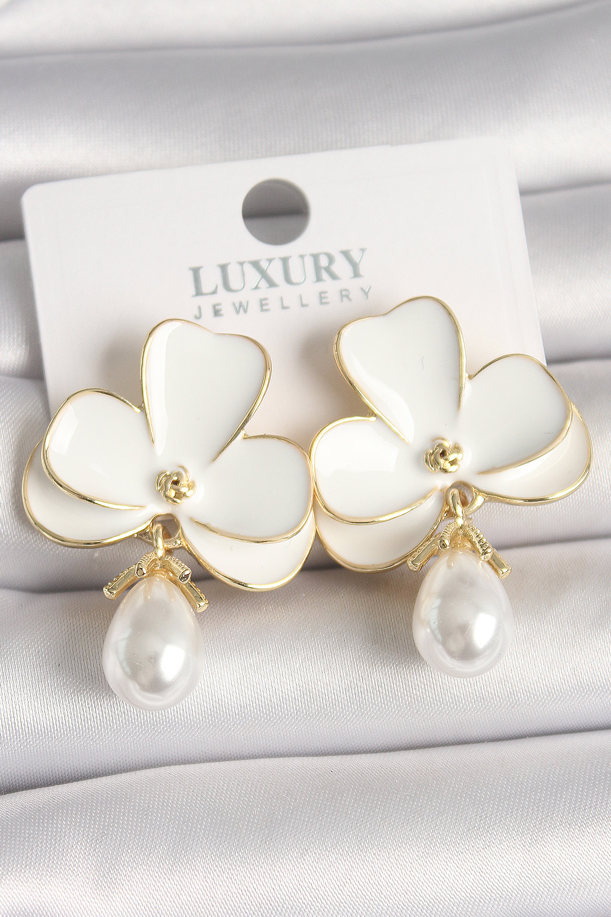 Pirinç Gold Renk Beyaz Çiçek Model Damla İnci Detay Kadın Küpe - TJ-BKP10459