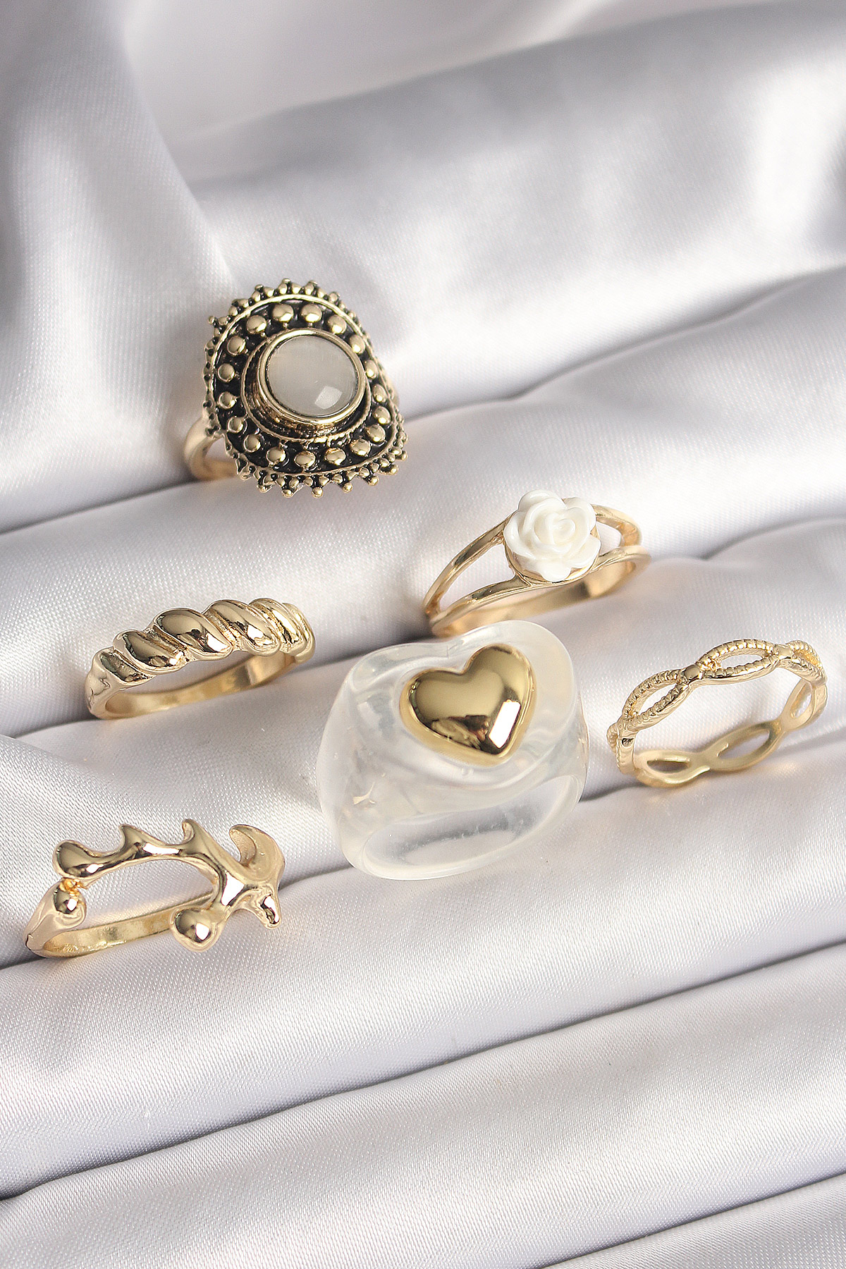 Pirinç Gold Renk Beyaz Gül Figür Kalp İşlemeli Sarmal Detay 6'Lı Kadın Yüzük Seti - TJ-BYK3639
